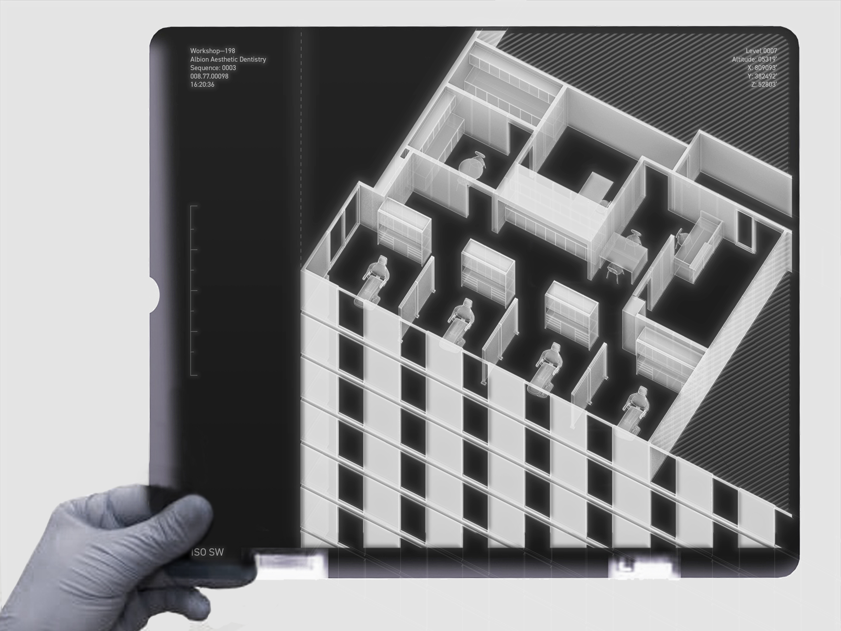 A young dentist was looking to renovate an existing dental practice located in a 1970’s era office tower in Denver, Colorado. The existing space was a corner unit and featured expansive views west toward the Rocky Mountains and downtown Denver. Due to the nature of the existing layout, these views were restricted to individual rooms along the perimeter of the space. The corner window of the unit was occupied by the dental lab, sterilization, and storage. This was an area only accessible to staff and created inefficiencies with accessing supplies while seeing patients.