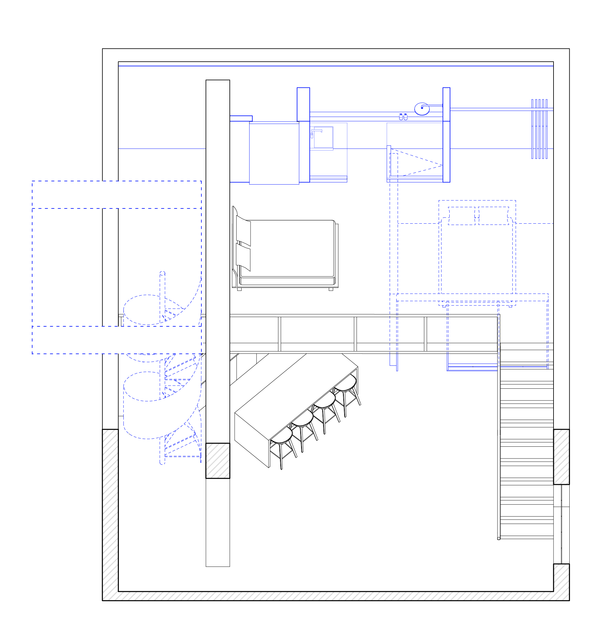 This renovation near City Park is located in a historic loft building built in 1930. The client was looking to better utilize space within their condo by adding an en suite bathroom to their mezzanine bedroom and a new guest bedroom/office downstairs. By designing the bathroom along the length of the demising wall it allowed for a poche of program that consolidated the bathroom and storage and allowed for an open mezzanine. Materials were selected that resonated with the client and complemented the Art Deco era of the existing building. In a future phase, a spiral stair will be added to access a roof deck via a large skylight.